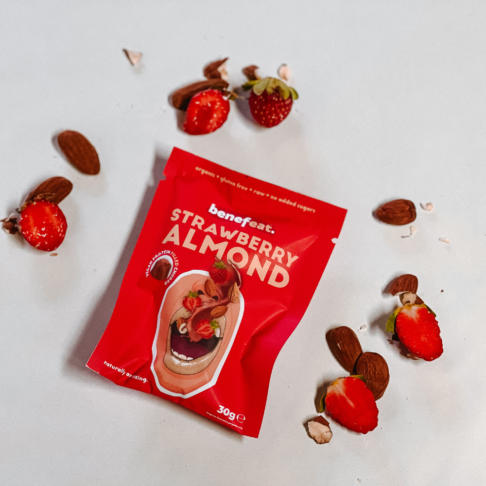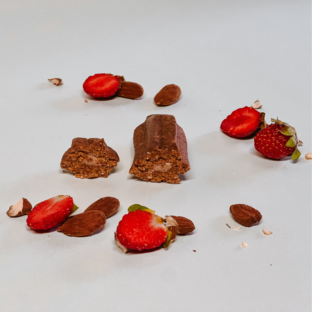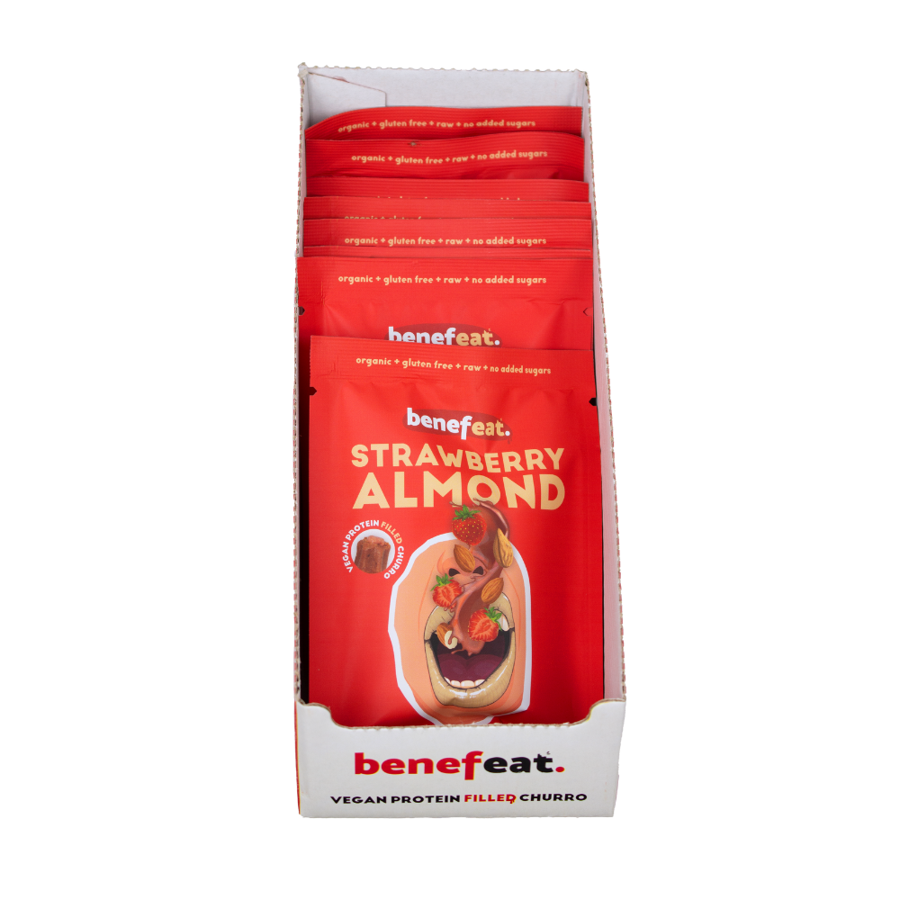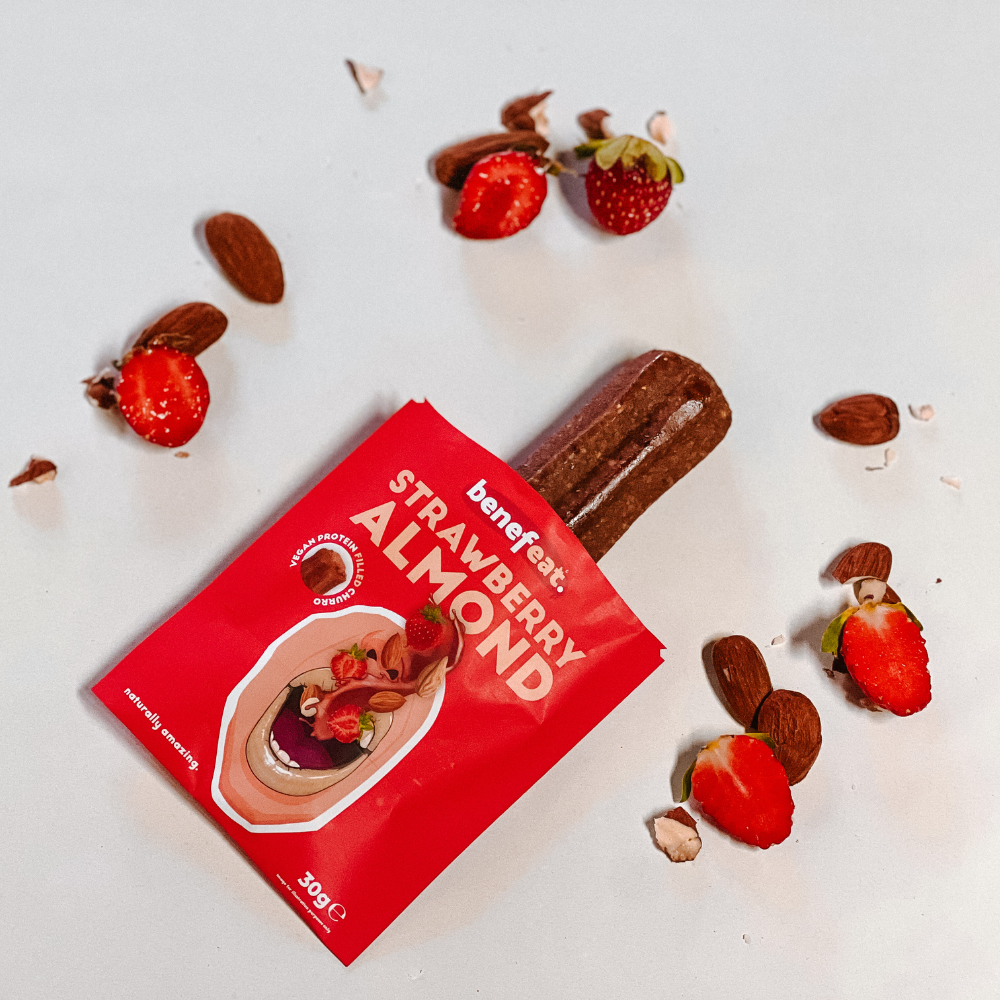 O churro proteico de amêndoa com recheio de morango é uma explosão de sabores e um vício dos bons.